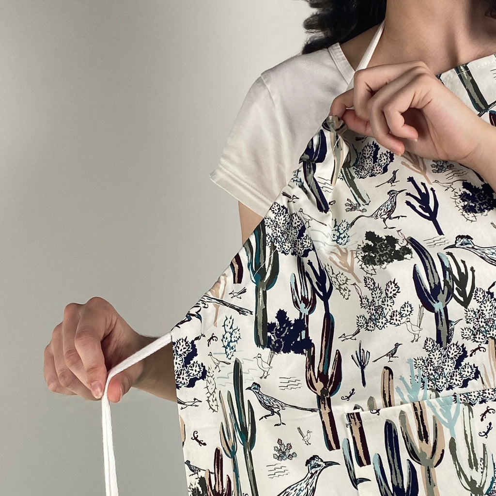 - (1) Artist-designed apron is made with sturdy 100% cotton, ready for cooking and baking, this easy-to-adjust drawstring favorite has a dual pocket front and an information tag to show various ways of tying off the incredibly versatile apron (but it comes already tied like example #3 on the card!).