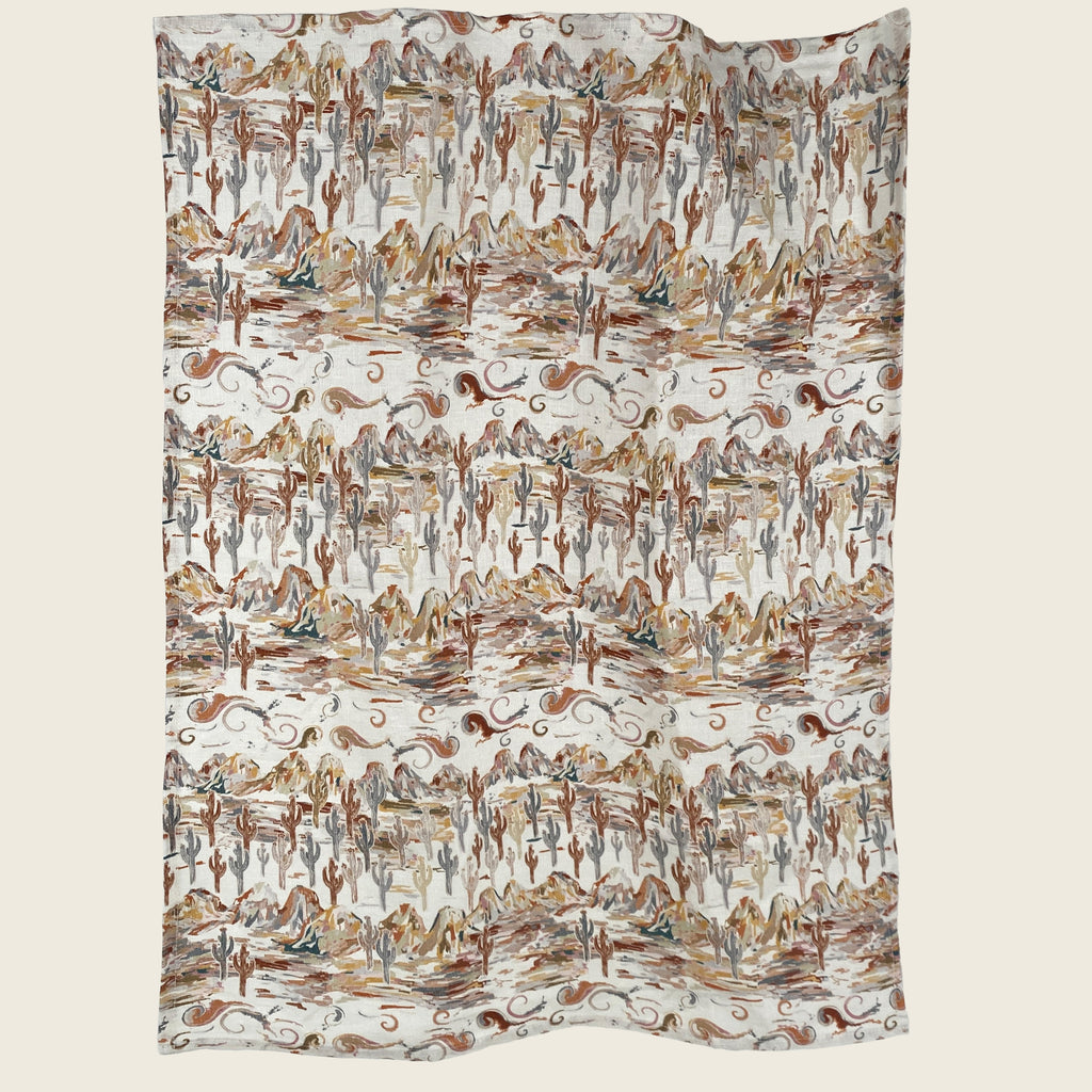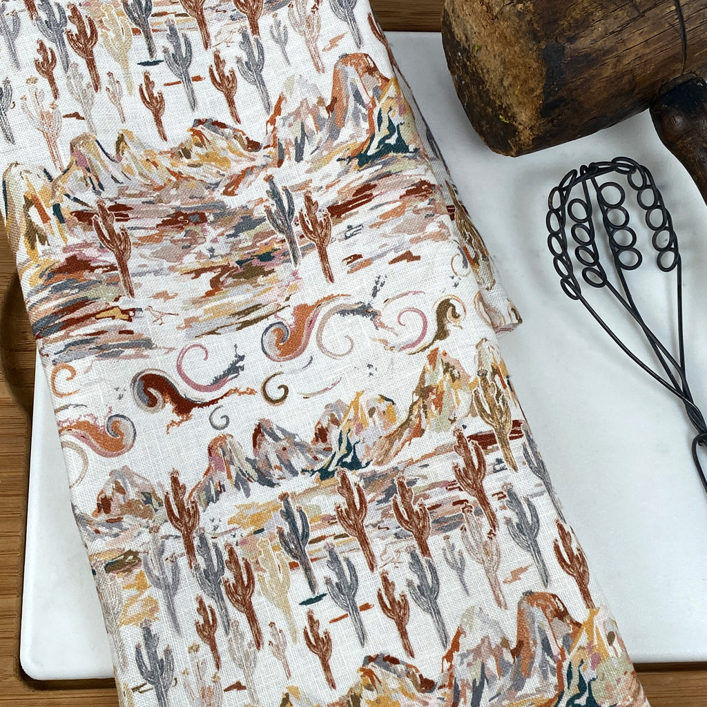 Painted Desert, a hand-painted watercolor design, adorns this upscale, functional art 100% linen tea towel with dreamy agate-colored southwestern mountains, saguaros, swirling clouds, wispy sands, and hidden roadrunners.